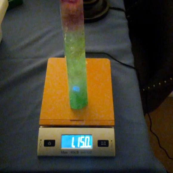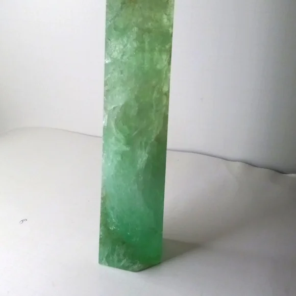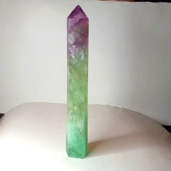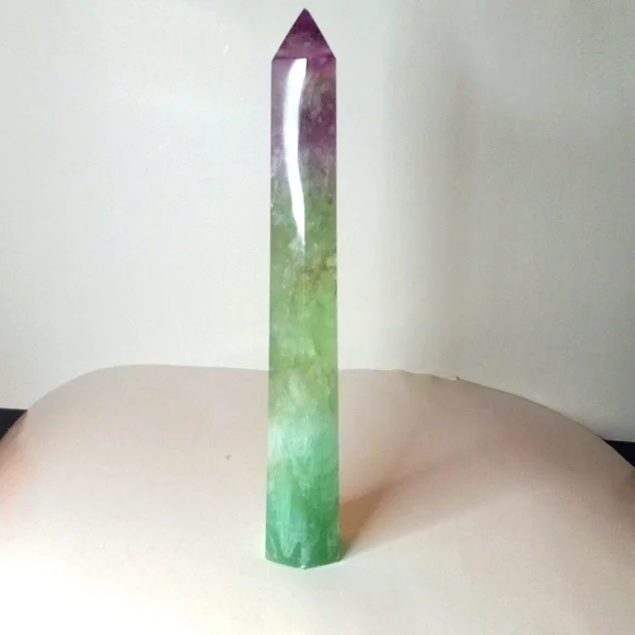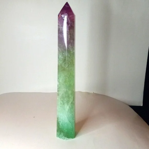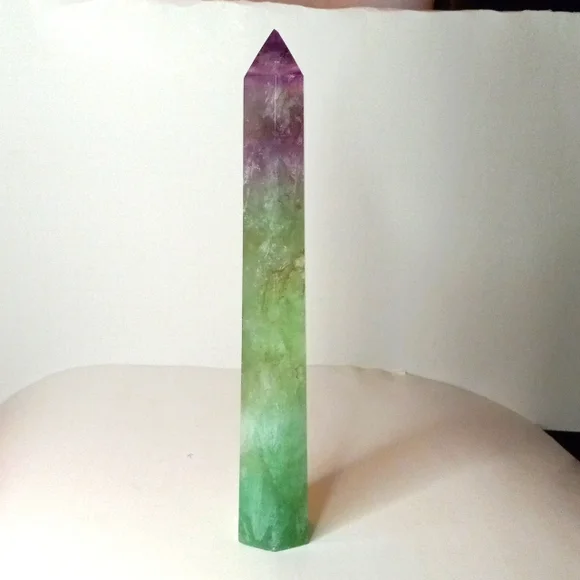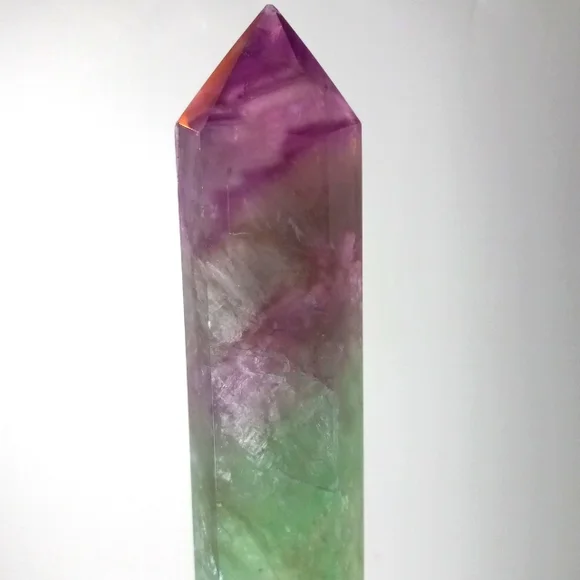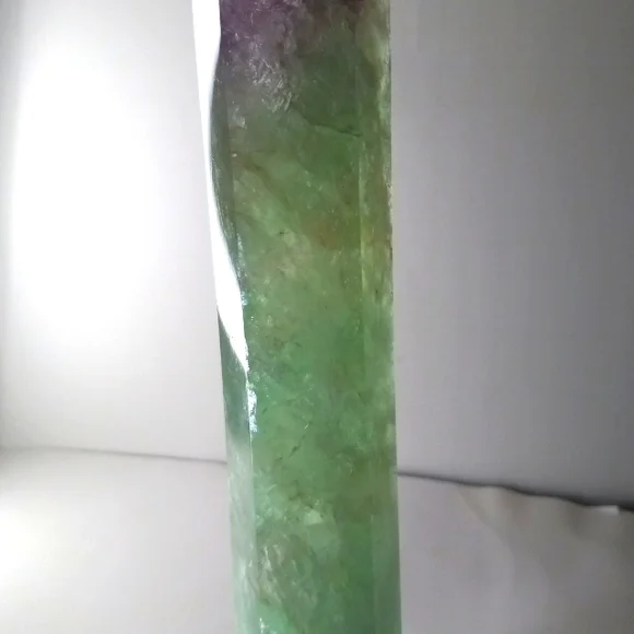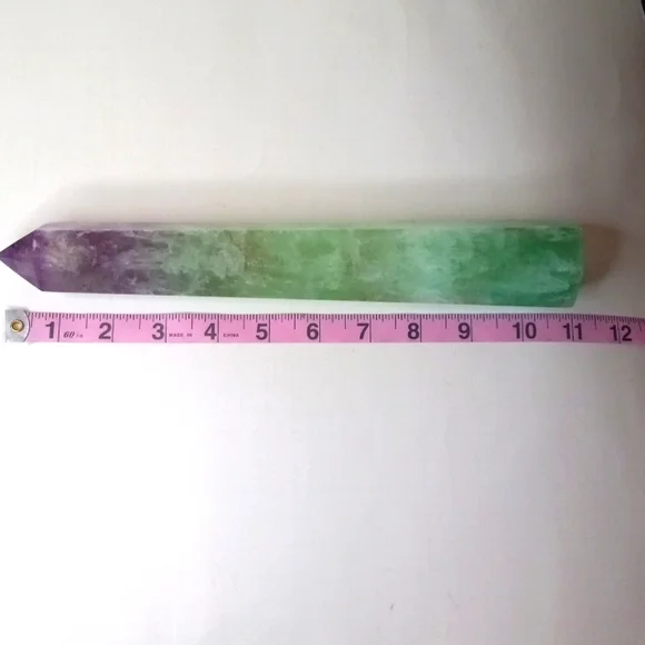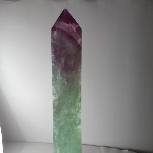 * This gorgeous fluorite starts with purple at the tip and fades into a green mint and into a darker mint green at the bottom.* 1.15 lbs weight* 11" height* 1.6" width* This piece is very memorizing as you look thru it and see all the beautiful crystals and feathers inside.* Crystal gemstones are natural minerals each of which has its own unique appearance. Internal ice cracks, surface stone grains, pits and inclusions are naturally formed.