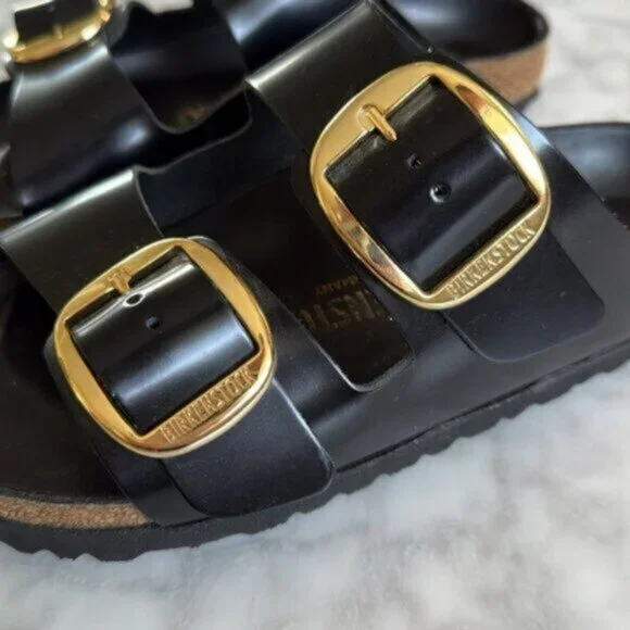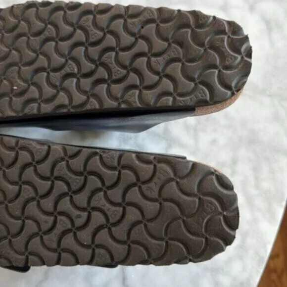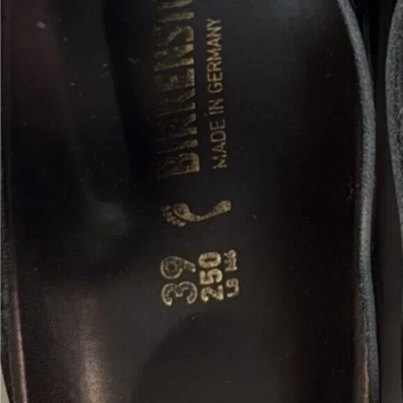 Worn twice, excellent condition. See photos for small signs of wear.Color: High shine black leather Flexible EVA outsole offers lightweight, shock absorbing support with lasting durability.Raised toe bar is designed to encourage the natural gripping motion of your feet, exercising your legs and aiding circulation.Slip-on design.Soft and breathable leather linings help wick away moisture.Made in Germany.