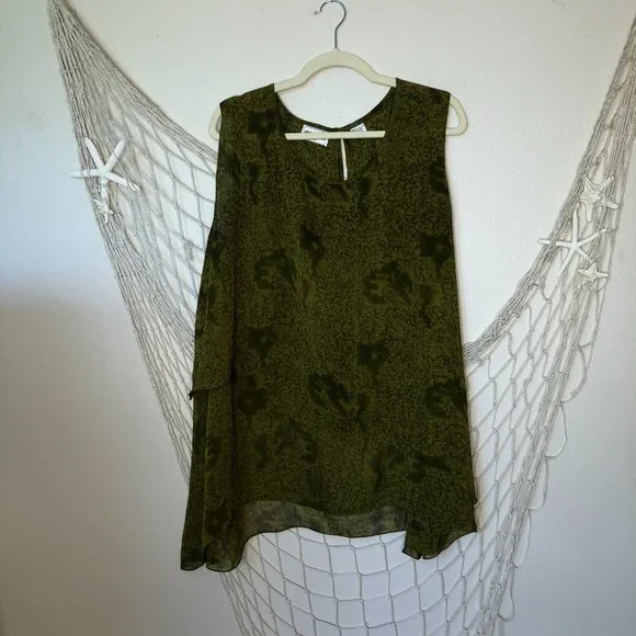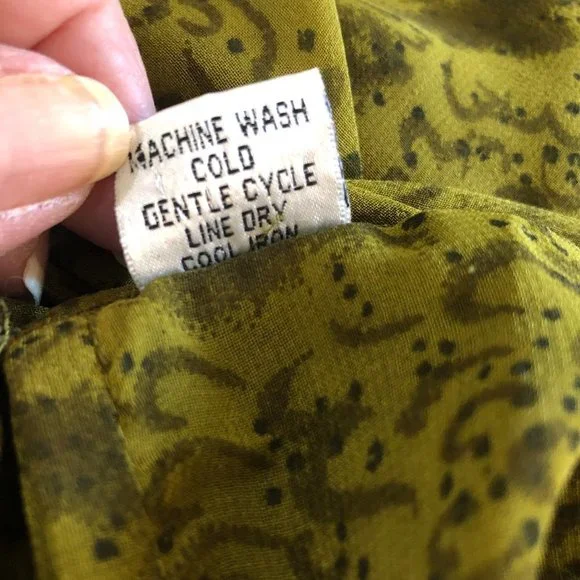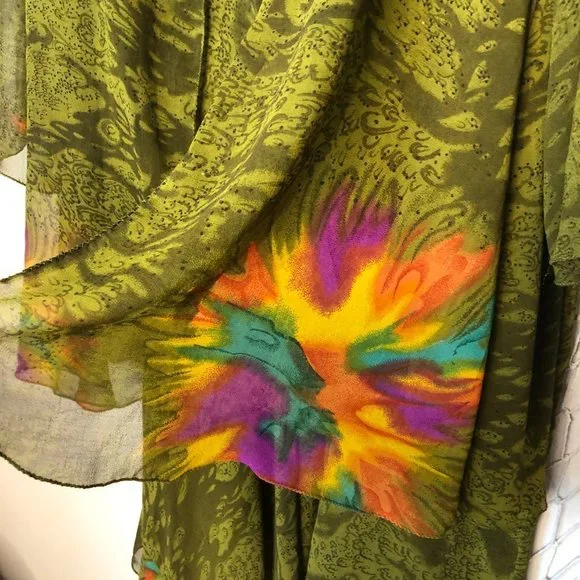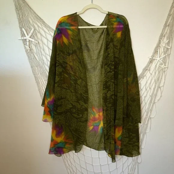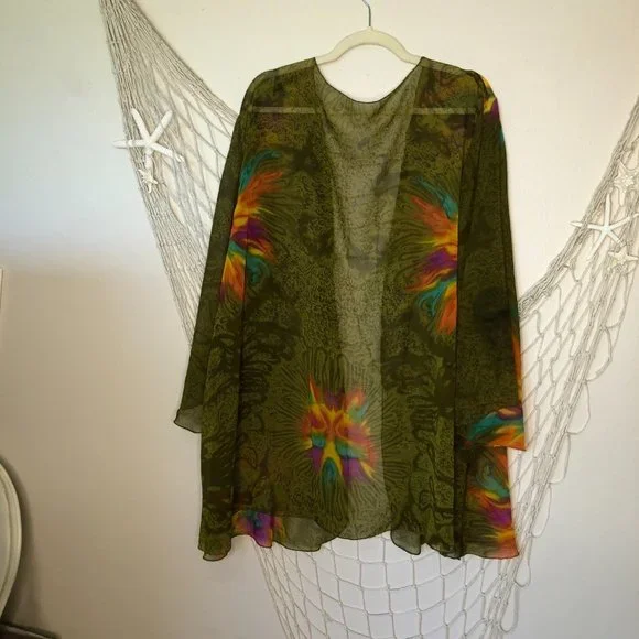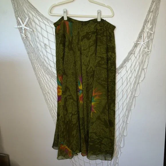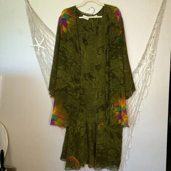 Wear all three pieces together, or with other items in your wardrobe. The asymmetrical sleeveless top has a back button keyhole closure. The open jacket has wide bell sleeves. The maxi skirt is lined and has an elastic waist. Excellent pre-owned condition.100% polyesterMachine wash coldLine dryApproximate measurements (flat lay):Sleeveless Top:armpit to armpit: 28"length: 34"Open Jacket:armpit to armpit: 29"length: 36.5"Maxi Skirt:waist: 18"length: 38"