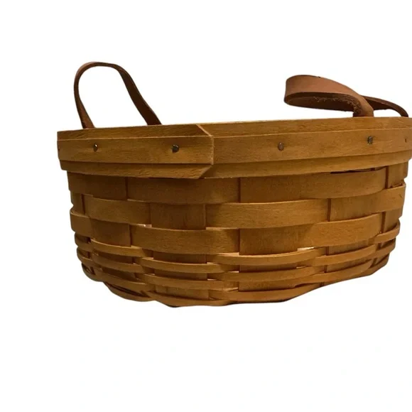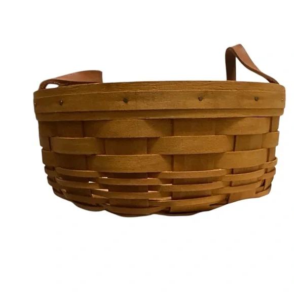 Longaberger Basket Handwoven Dresden, Ohio USASigned CLB 1998 Round woven basket with leather handles. Features a clear plastic divider inside. Perfect for organizing or display.Longaberger Round Basket, likely the 2001 edition, complete with a protector and liner. These handcrafted baskets are known for their durability and versatility. Material: Made from hardwood maple.Design: Features an inverted bottom and leather handles.Functionality: Can be used for serving, organizing, or as a decorative piece.Included Accessories: Comes with a plastic protector and a divided liner.Brand: Longaberger, a company known for quality baskets since 1896.Care: The plastic protector is BPA-free and food-grade safe.Origin: Handcrafted in Dresden, Ohio.Note: The liner may need cleaning due to prior use.