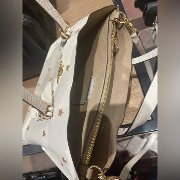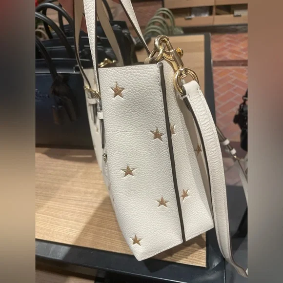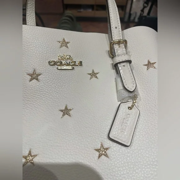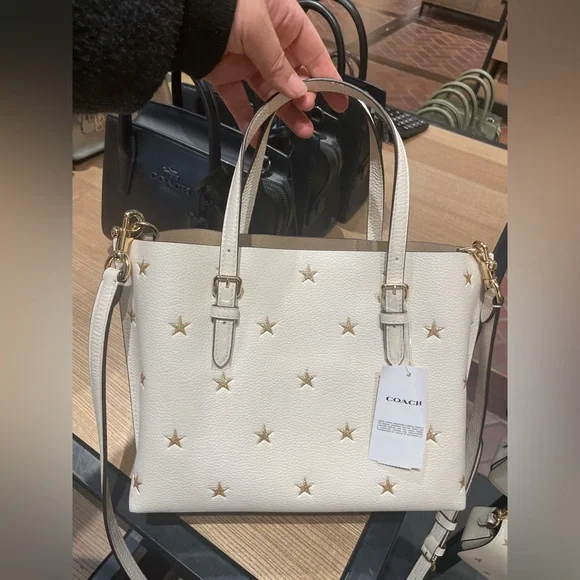 MOLLIE TOTE BAG 25 WITH STAR PRINT (COACH CW022)COACH STYLE # CW022| Double face leather and refined pebble leather | Zip-top closure, fabric lining | Side open compartments | Handles with 4 3/4" drop | Detachable strap with 22" drop for shoulder or crossbody wear | 9 3/4" (L) x 7 1/2" (H) x 4 3/4" (W)|Style No. CW022|
