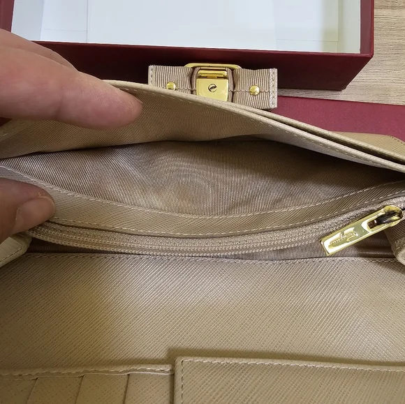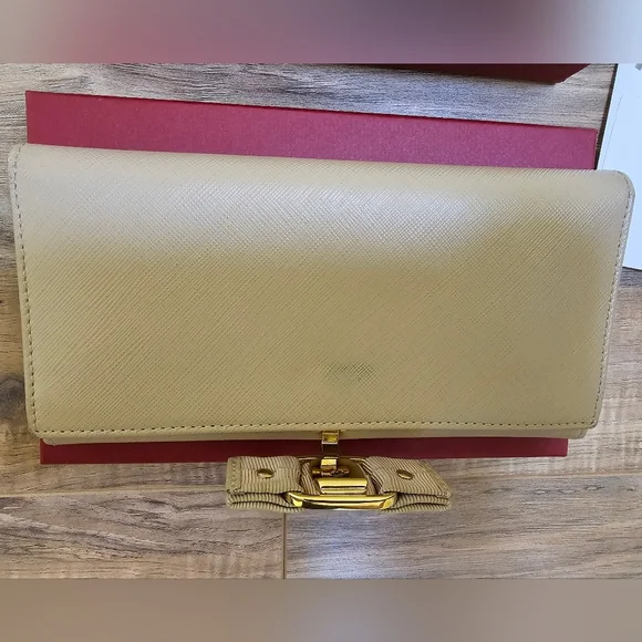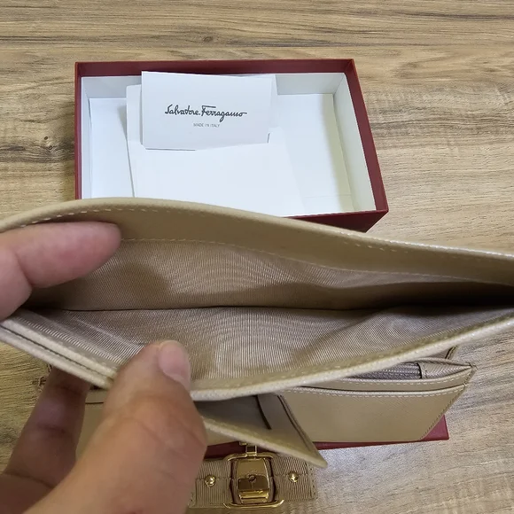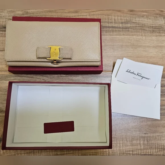 Pre-loved Authentic Salvatore Ferragamo Vara Ribbon Long Wallet Leather Beige Color: BeigeCondition: rank AGold tone hardware Comes with a box, tissue paper, andcustomer card.Authenticity code/Date code IR-22A900Approximate measurements: 7.5"×3.75"Please check the pictures and the video before deciding.Feel free to ask questions.All sales are final. Thanks for visiting my closet.