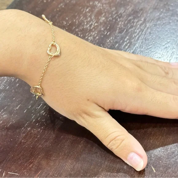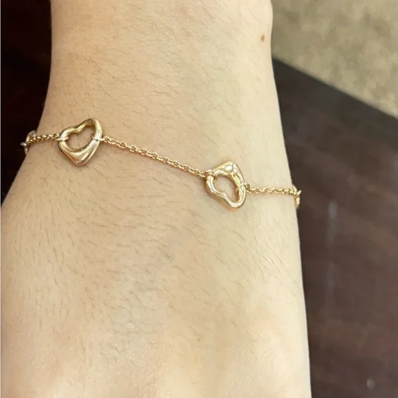 Indulge in luxury with this stunning Tiffany & Co. 18k rose gold open heart bracelet. Crafted with precision, this bracelet features a beautiful heart shape adorned with a pink color hue, adding a touch of femininity to any outfit. The rose gold metal compliments the design and adds a sense of elegance and sophistication. The bracelet is part of the Tiffany & Co. Hearts collection, making it a timeless piece that will never go out of style. Perfect for any occasion, this bracelet is a must-have for any jewelry lover.Pre loved condition size 7.25 inch