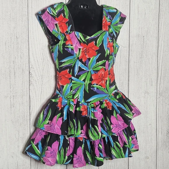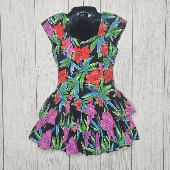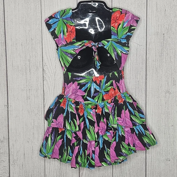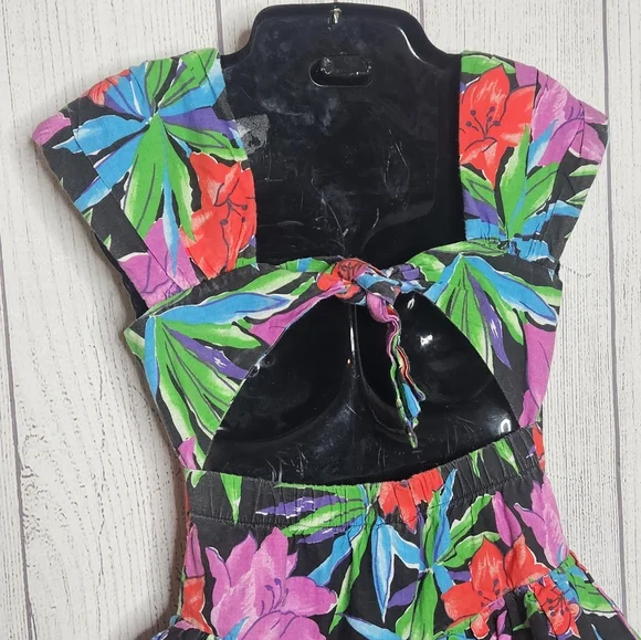 VTG 90s Girls Tropical Floral Print Open Back Party Dress, sz 10brand: Amy Too!size: girls size 1090s party dressvintage fashionside ponytail optionaltropical floral printblack with blue, green, purple, pink, and red flowers and leavesbrightfunkysleevlesspadded strapsopen backties in the backelastic waist in the backtiered skirt100% cottonmade in the USA summer dresssuch a fun dress!Measures: (taken flat, double where necessary) pit to pit - 14.5"waist - 12"length - 27"please verify fit before purchasing in good vtg condition
